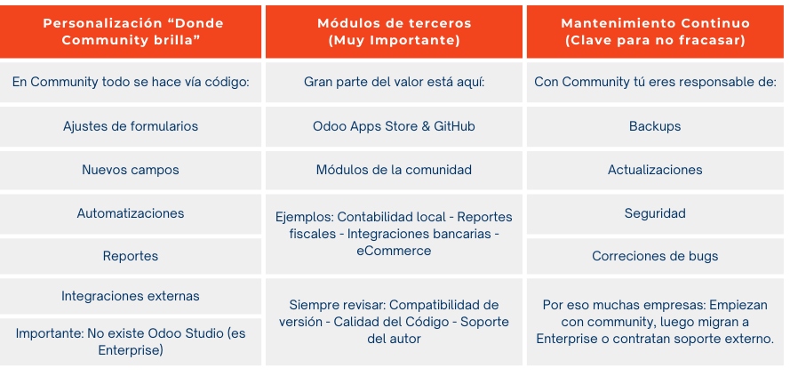 Desde un enfoque estratégico de negocio, Odoo Community se utiliza como una herramienta de ventaja competitiva, no solo como un ERP. Es cierto que permite reducir significativamente el coste de licencias, ya que se elimina el pago mensual por usuario (que en Odoo Enterprise ronda los 12 € al mes más IVA por usuario). Sin embargo, este ahorro implica asumir otro modelo de inversión: el acompañamiento de un partner. En Odoo Community no se paga por usuarios, sino por conocimiento y servicio, es decir, por las horas de implementación, configuración, desarrollo y soporte, ya sea mediante un servicio continuo o intervenciones puntuales cobradas por hora. Este coste no es estándar ni fijo, se define caso a caso, tras un análisis previo del negocio, sus procesos y necesidades reales, y siempre se acuerda directamente con el partner. Por eso, más que un gasto, Odoo Community se convierte en una inversión estratégica para crear soluciones a medida, diferenciarse de la competencia y escalar el negocio sin depender del número de usuarios.