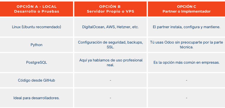 Segundo, Odoo se puede usar de tres formas distintas según dónde esté alojado: